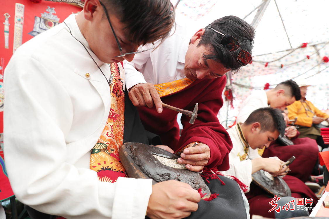 日前,在青海省杂多县举办的2022澜湄国际影像周上,金属锻造制作技艺传承人土丁江才在非遗文化展示区内,指导徒弟进行金属打制。近年来,该县多措并举,以非遗“活化”推动其传承与保护,并借助电商渠道,开展线上线下销售助力非遗产品销往甘肃、四川、云南、西藏等地,部分产品还远销尼泊尔等国家。(光明网记者 季春红摄/光明图片)